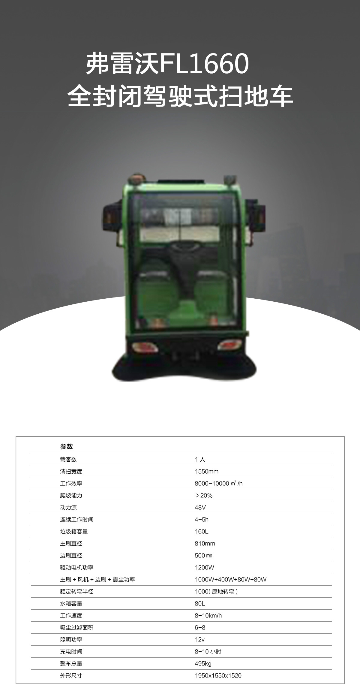 產品分類:駕駛式掃地機產品特點:1、全封閉駕駛式掃地機1660特有出口型免維護電瓶,區別于市面上其他電動掃地機,其智能型充電機能有效延長電瓶使用壽命,可使連續工作時間更長。2、全封閉設計保護工作人員身心健康。3、底部主刷和兩側邊刷可自由調節高度使清掃效率更高,清掃寬度達到1550mm,完成1000㎡的地面清掃工作僅需6分鐘,比傳統人力清掃效率提高幾十倍,并且還能節省人力成本,省時省力、更省錢!4、控制面板友好,操作簡單、易懂,使用前工作人員無需特別培訓,“保潔大媽也能輕松操作完成清掃任務”。5、配備的優良吸塵系統能夠有效抑制揚塵的產生,避免二次污染。適用環境:車站、機場、物業小區、倉庫、車間、園區、廣場、學校、醫院、商場、公園、市政單位、街道等公共場所地面。