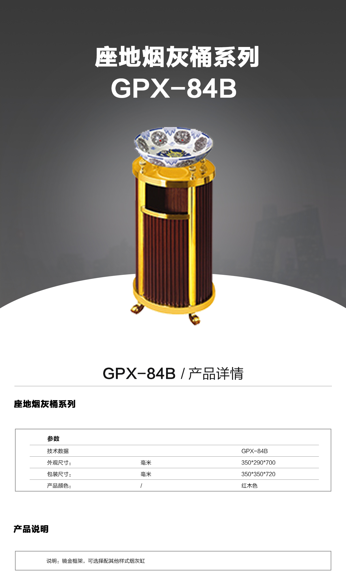 仿古垃圾桶84B外觀設(shè)計(jì)大氣、端莊,結(jié)實(shí)耐用,適用于酒店、大堂、辦公樓、物業(yè)等。